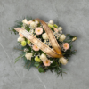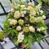 - Skład wieńca: róża, goździk, lewkonia, chryzantema, alstremeria, zieleń dekoracyjna.