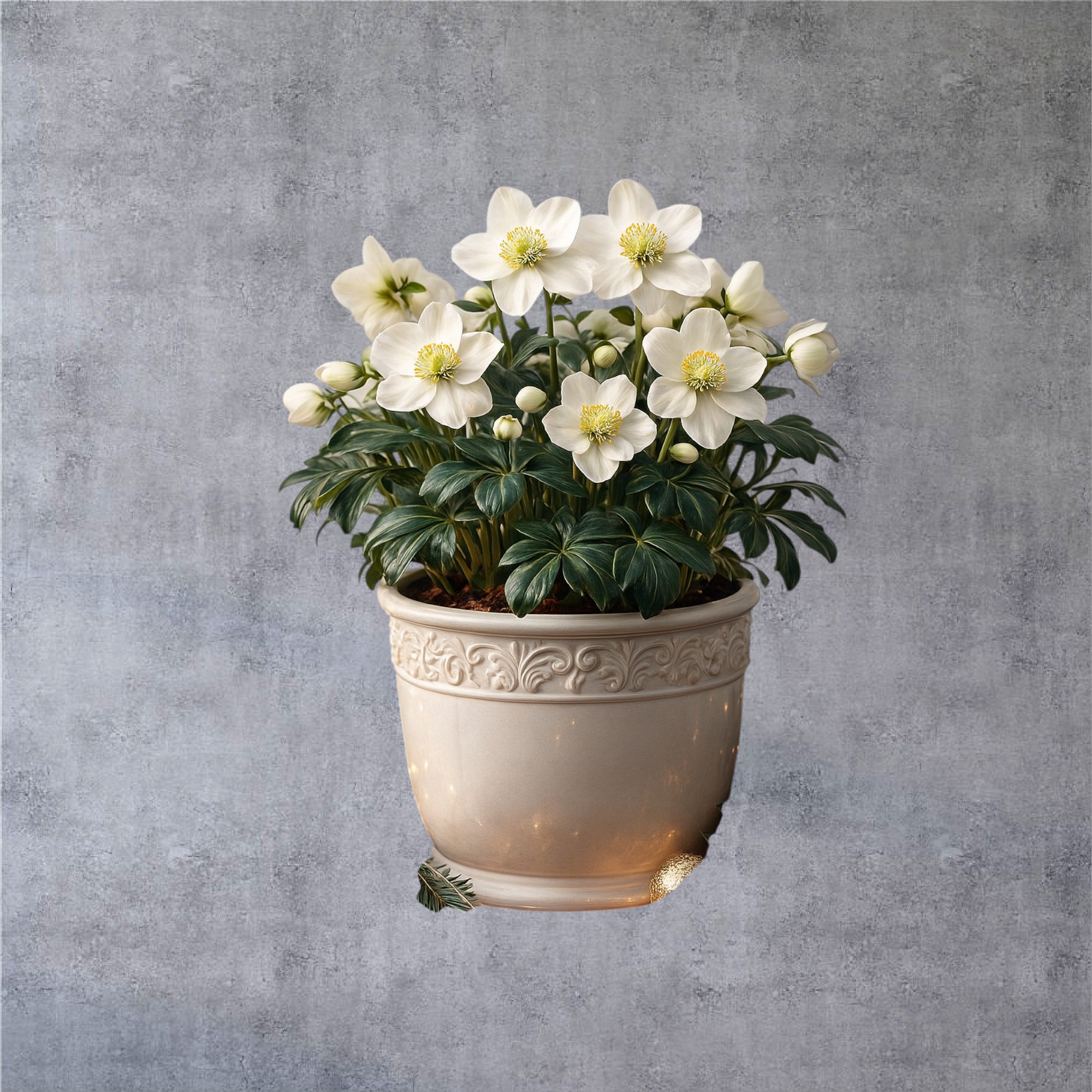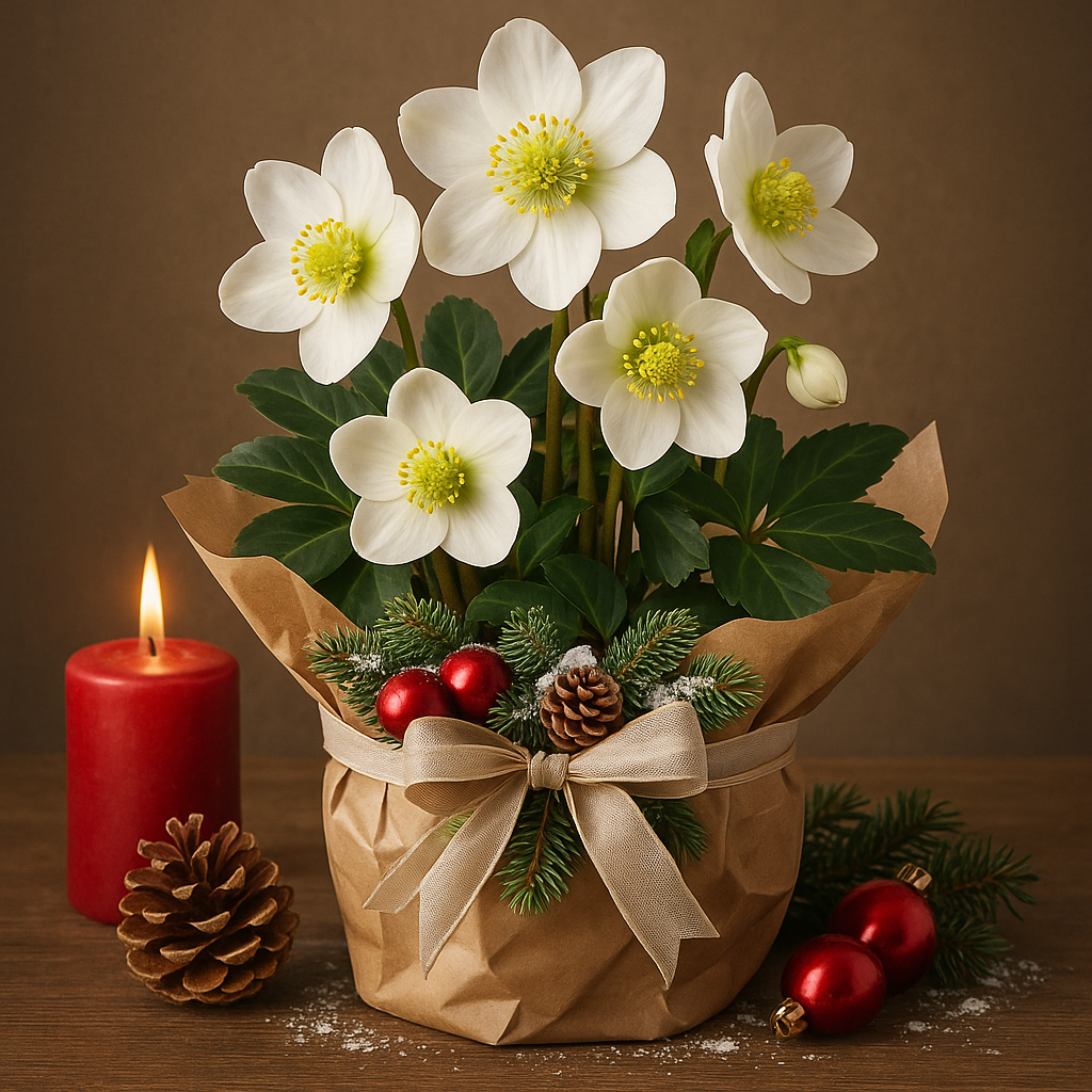 Biały ciemiernik w doniczce bez przybrania lub z przybraniem świątecznym w ozdobnej osłonce.