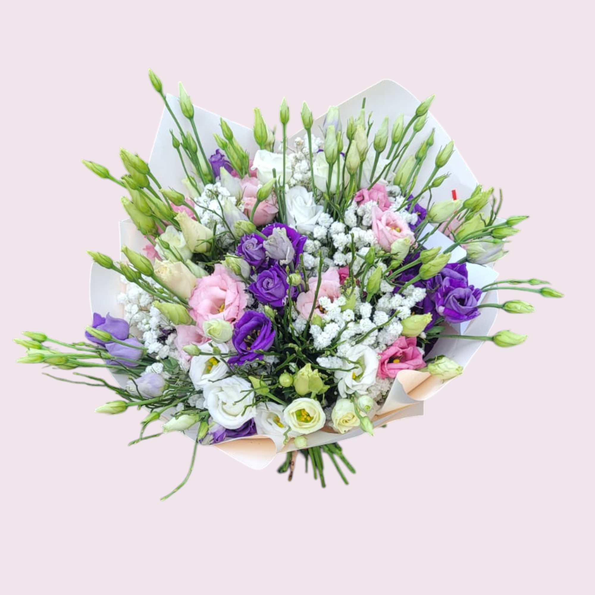 Subtelna kompozycja przepięknych różnokolorowych eustom, idealnie podkreśli piękno obdarowanej osoby. Różowe, białe, fioletowe to najpopularniejsze kolory eustom przez co każda kobieta będzie zadowolona.