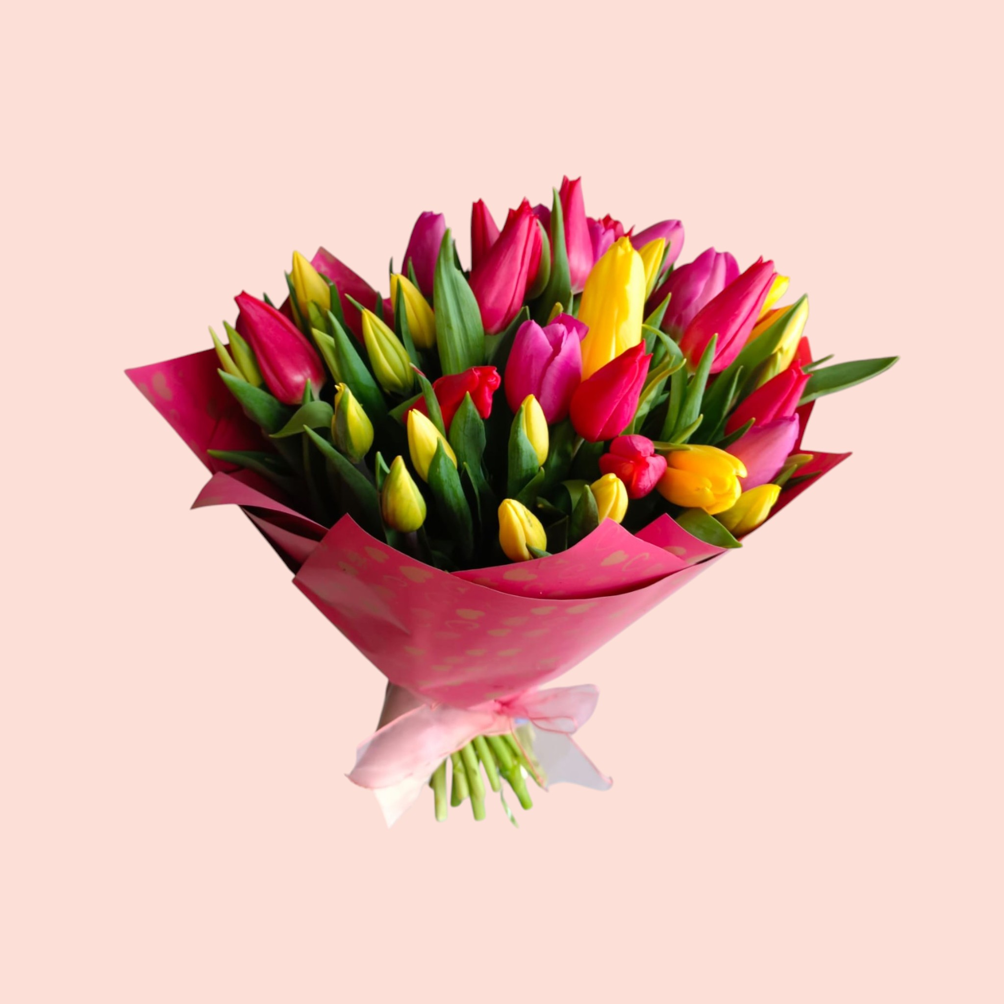 Wybierz kolorystykę tulipanów jaka najbardziej przypadła ci do gustu. My wykonamy kompozycje i dodamy do niej kolorowy papier ozdobny i wstążkę.