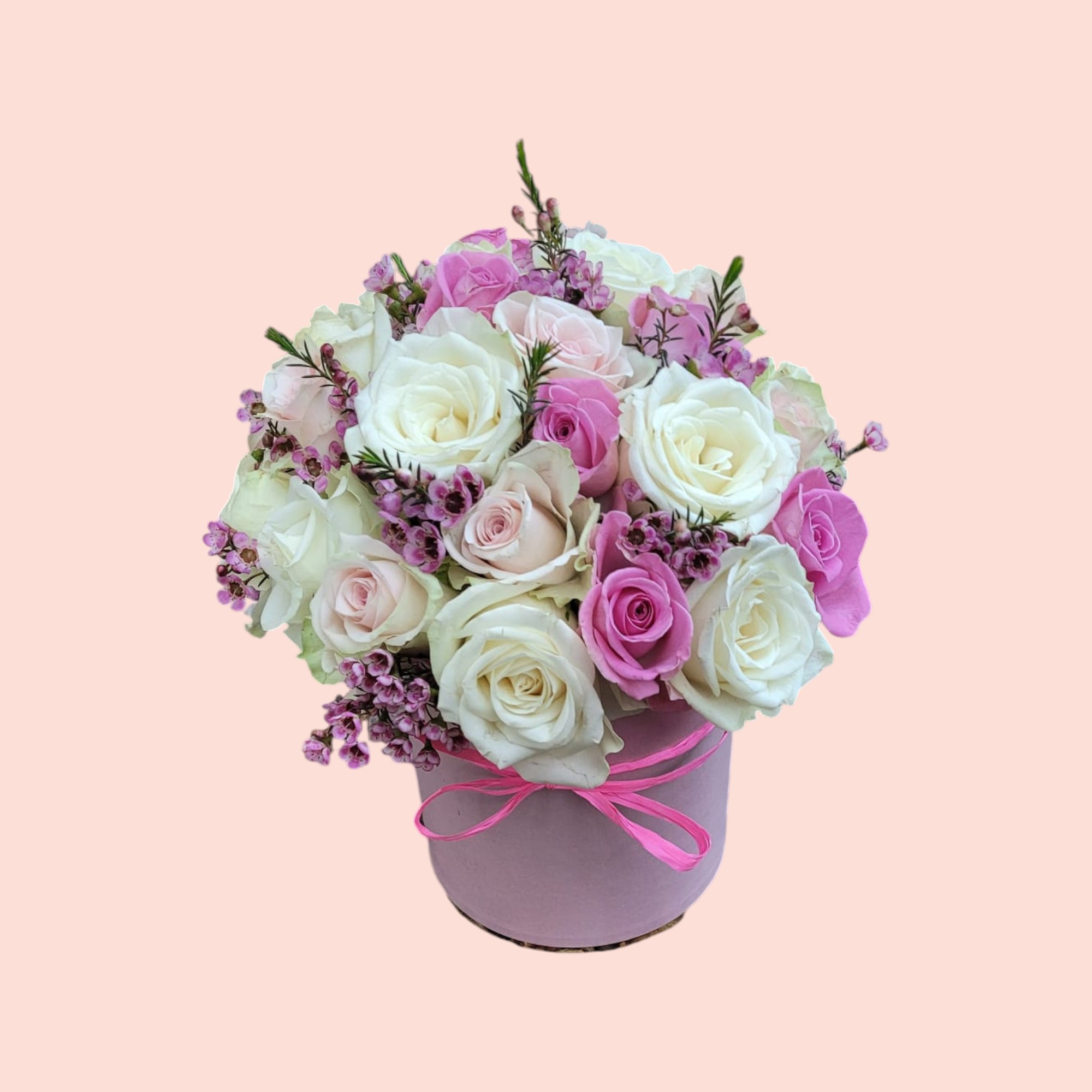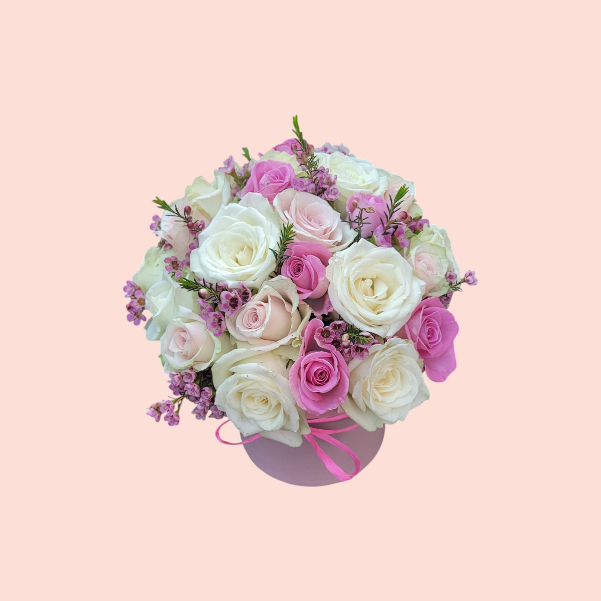 Box pełen elegancji, której nadają mu piękne białe i różowe róże. Ta kompozycja sprawdzi się również jako dekoracja weselna lub jako prezent urodzinowy.