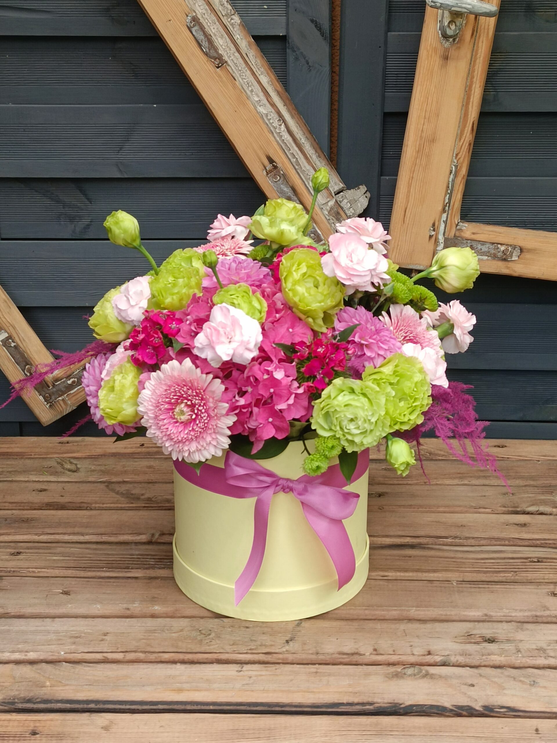 Kwiaty w pudełku w kolorze różu i zieleni z przybraniem. Kwiaty mieszane pasujące do siebie kolorystycznie jak i gatunkowo. Piękny box, który nada się na przeróżne okazje od urodzin po podziękowania.