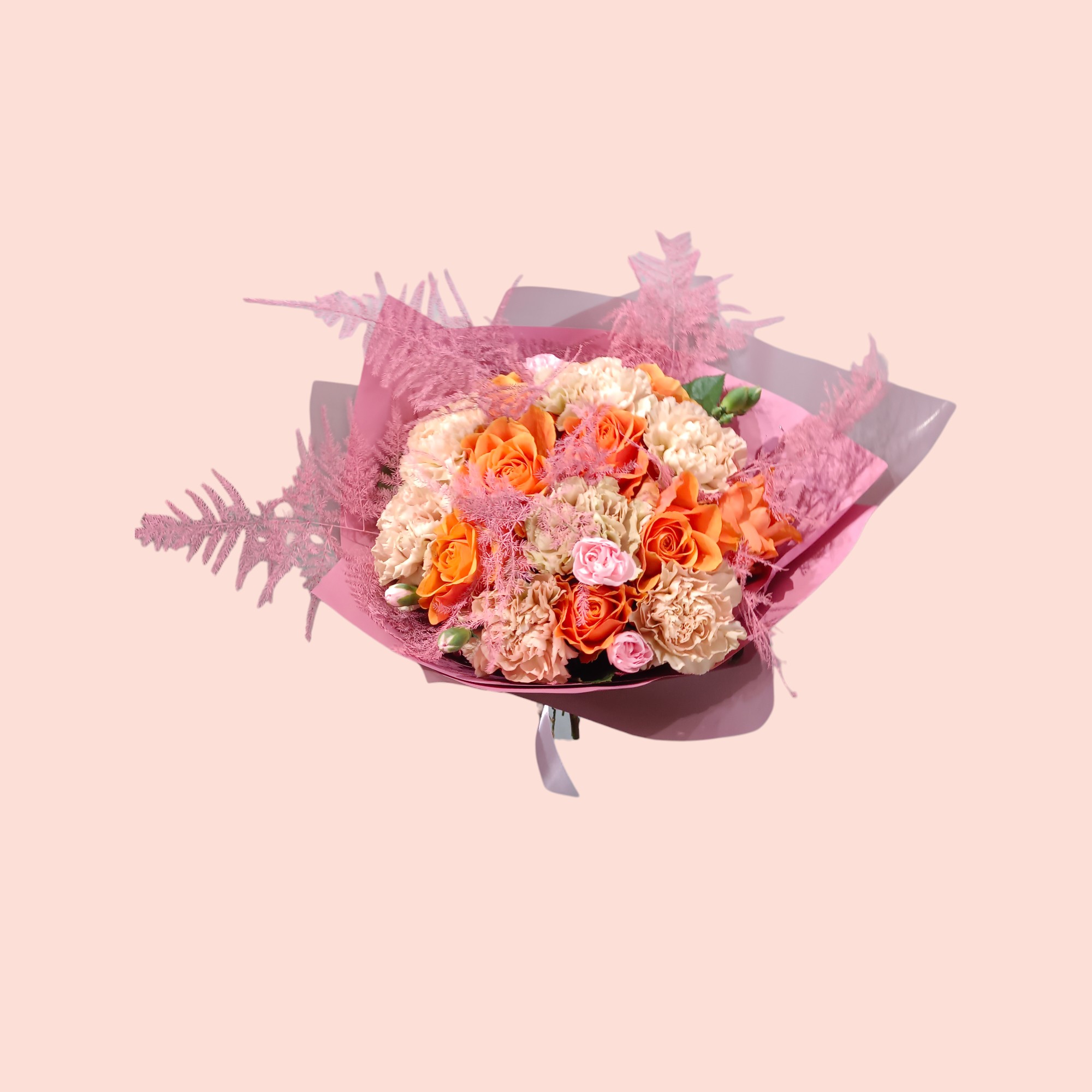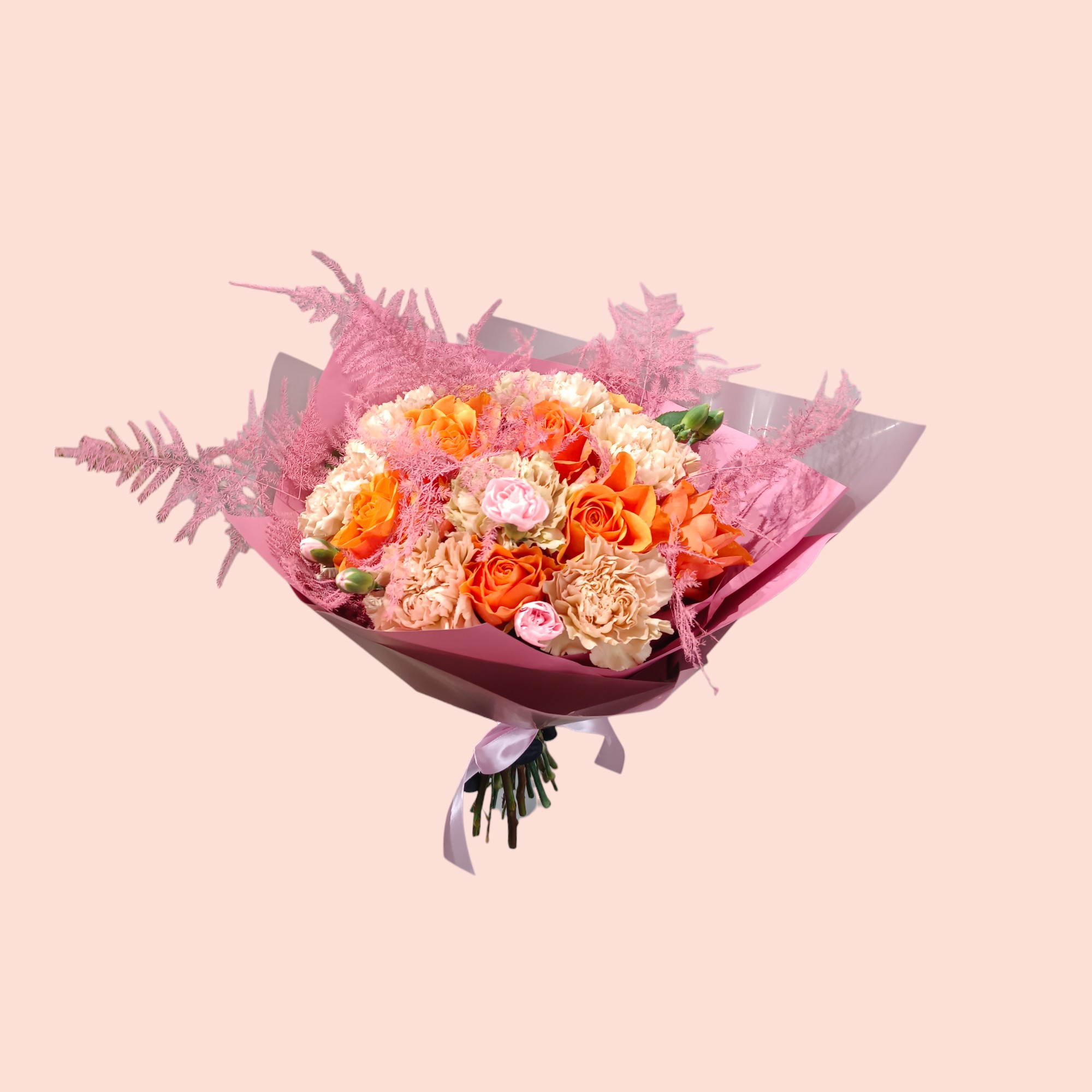 Bukiet w tonacji jesiennej, pomarańczowo-różowy. Kolorowy ale stonowany, przyjemny dla oka i serca. Bukiet przyozdobiony kolorową kryzą i wstążką. Bukiet z róż i goździków z przybraniem.