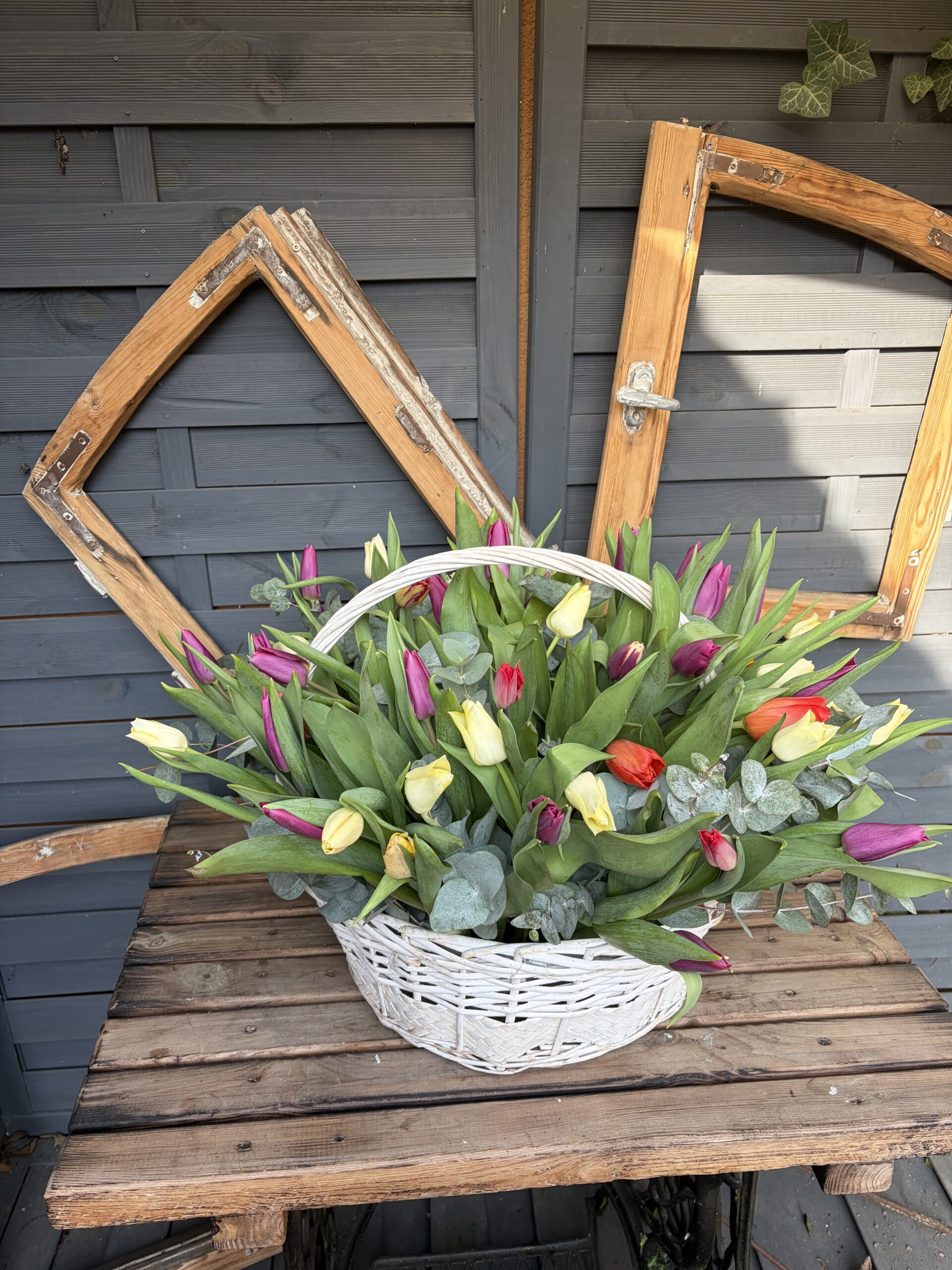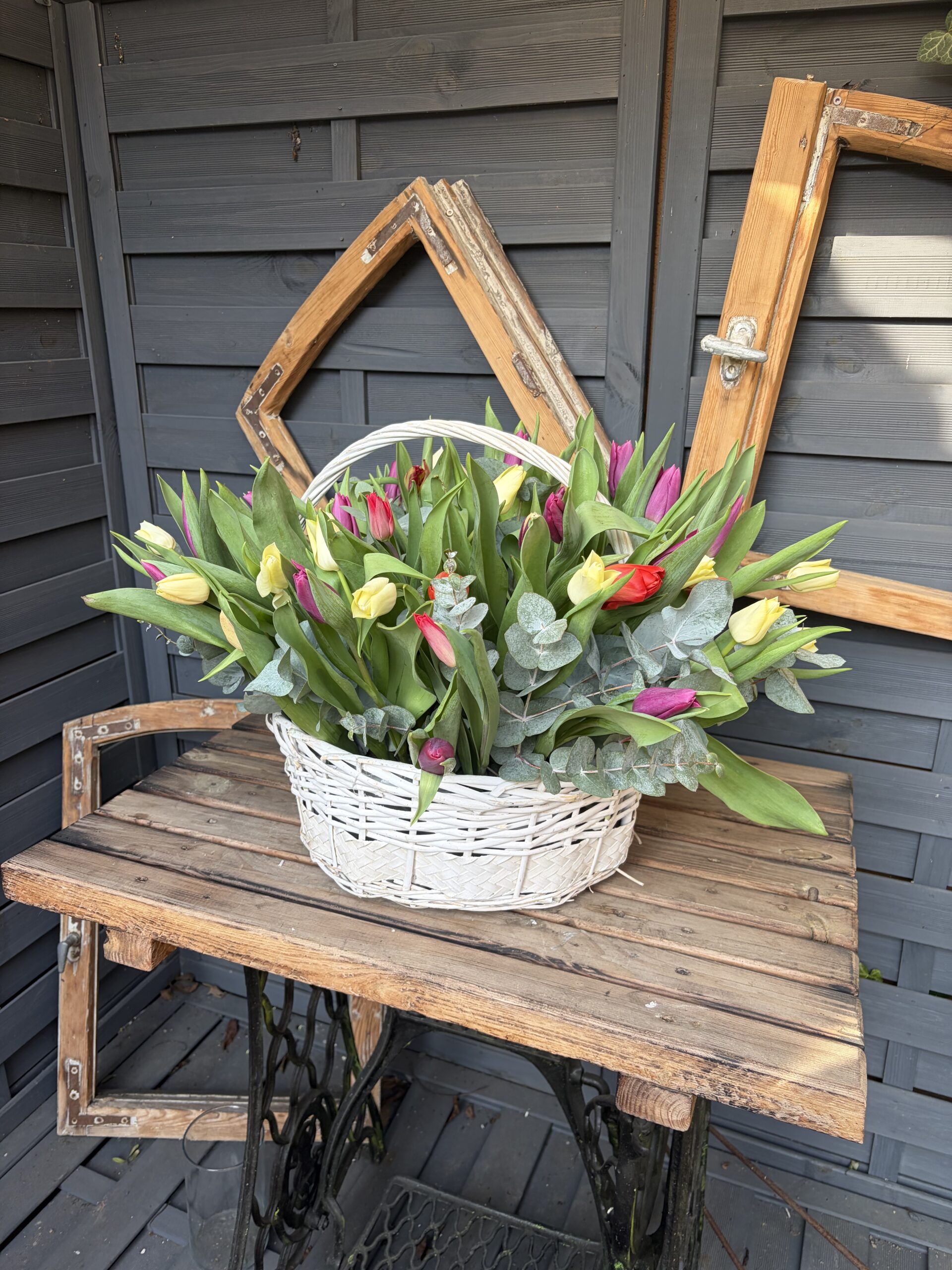 Kosz wypełniony kolorowymi tulipanami z delikatnym ale wyraźnym przybraniem. Cudowna kompozycja wiosenna, która umili Ci dzień.