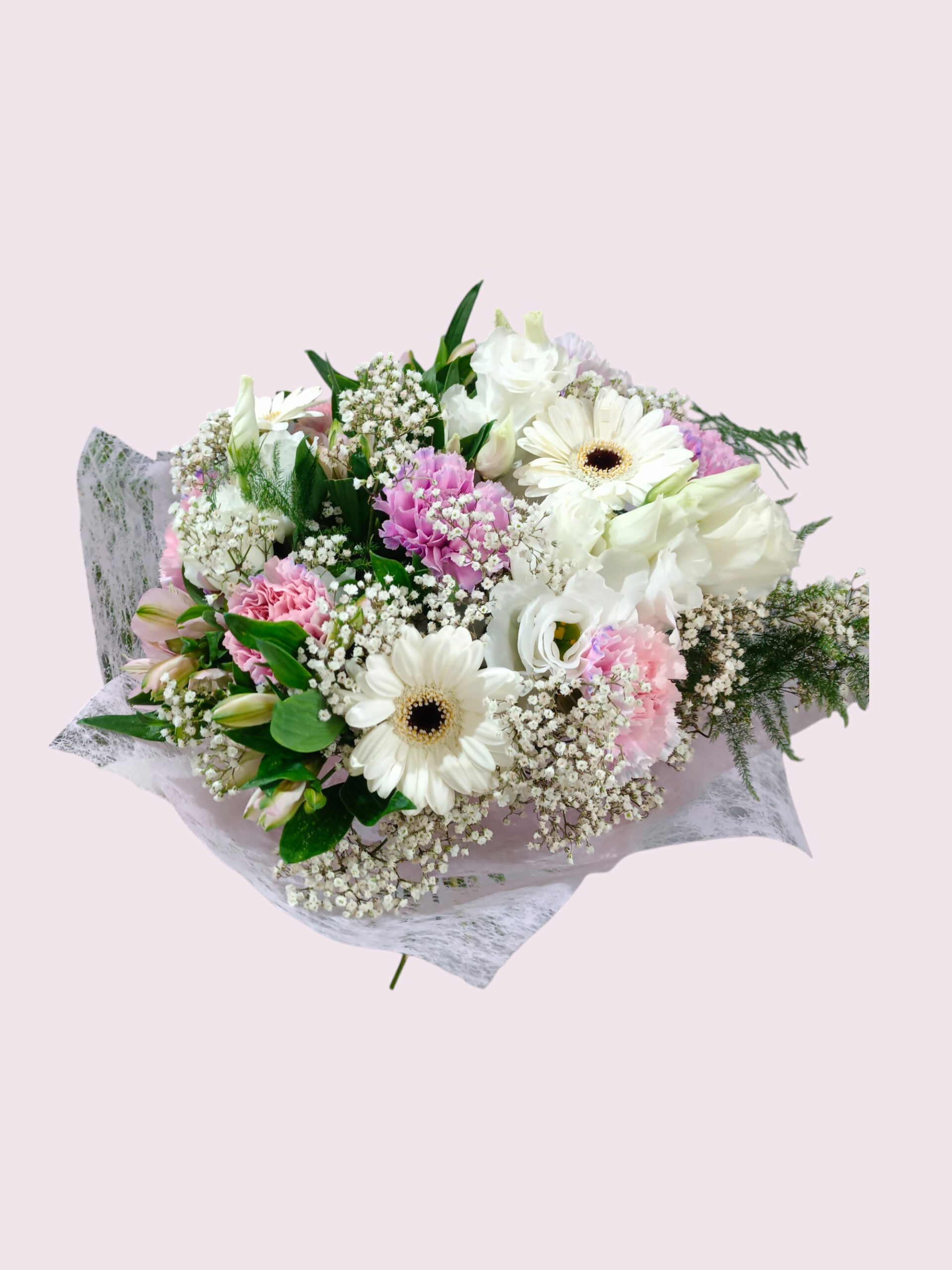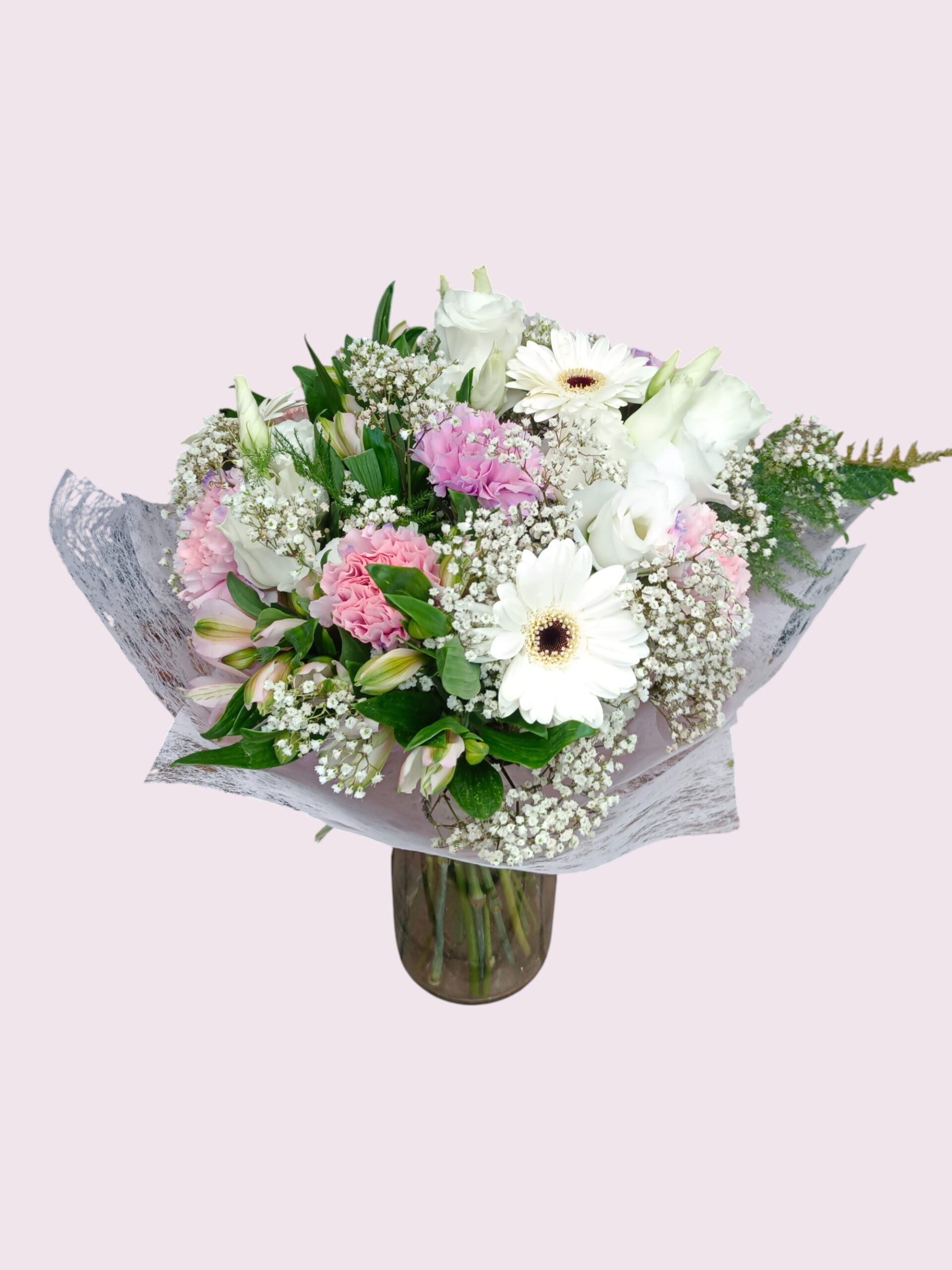Delikatny, jasny bukiet o miękkiej, subtelnej kompozycji. Łączy w sobie lekkość kremowych tonów z różem i zielenią, tworząc wrażenie świeżości i harmonii. Idealny na wyjątkowe, spokojne momenty i eleganckie okazje.