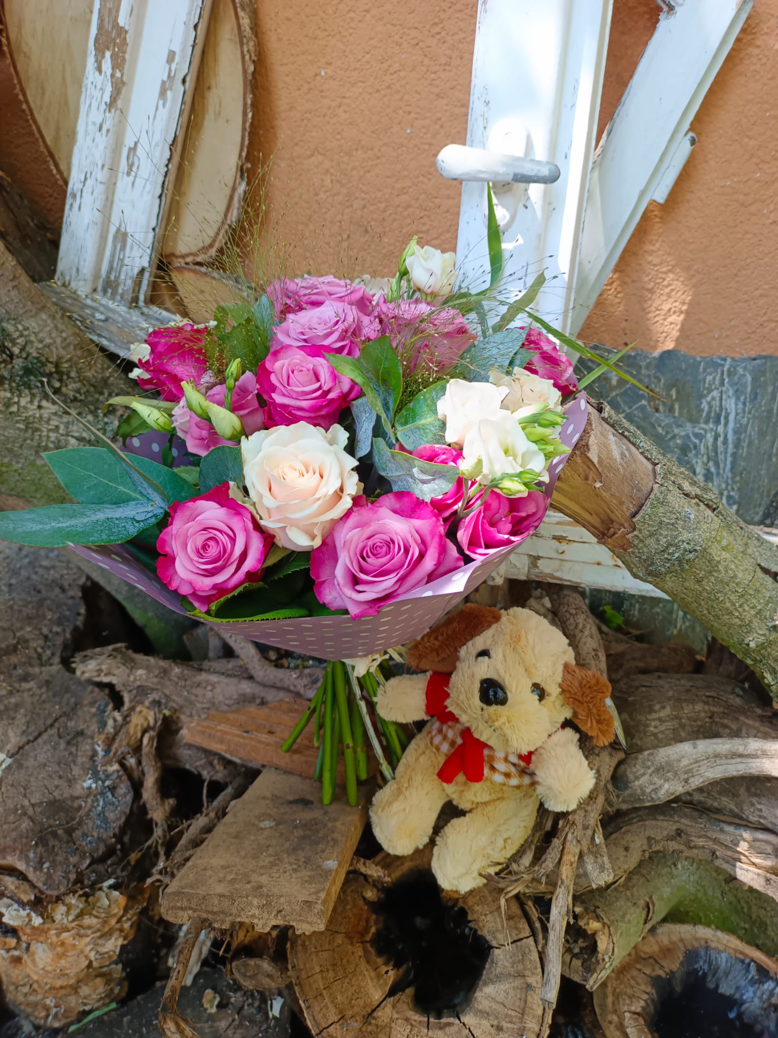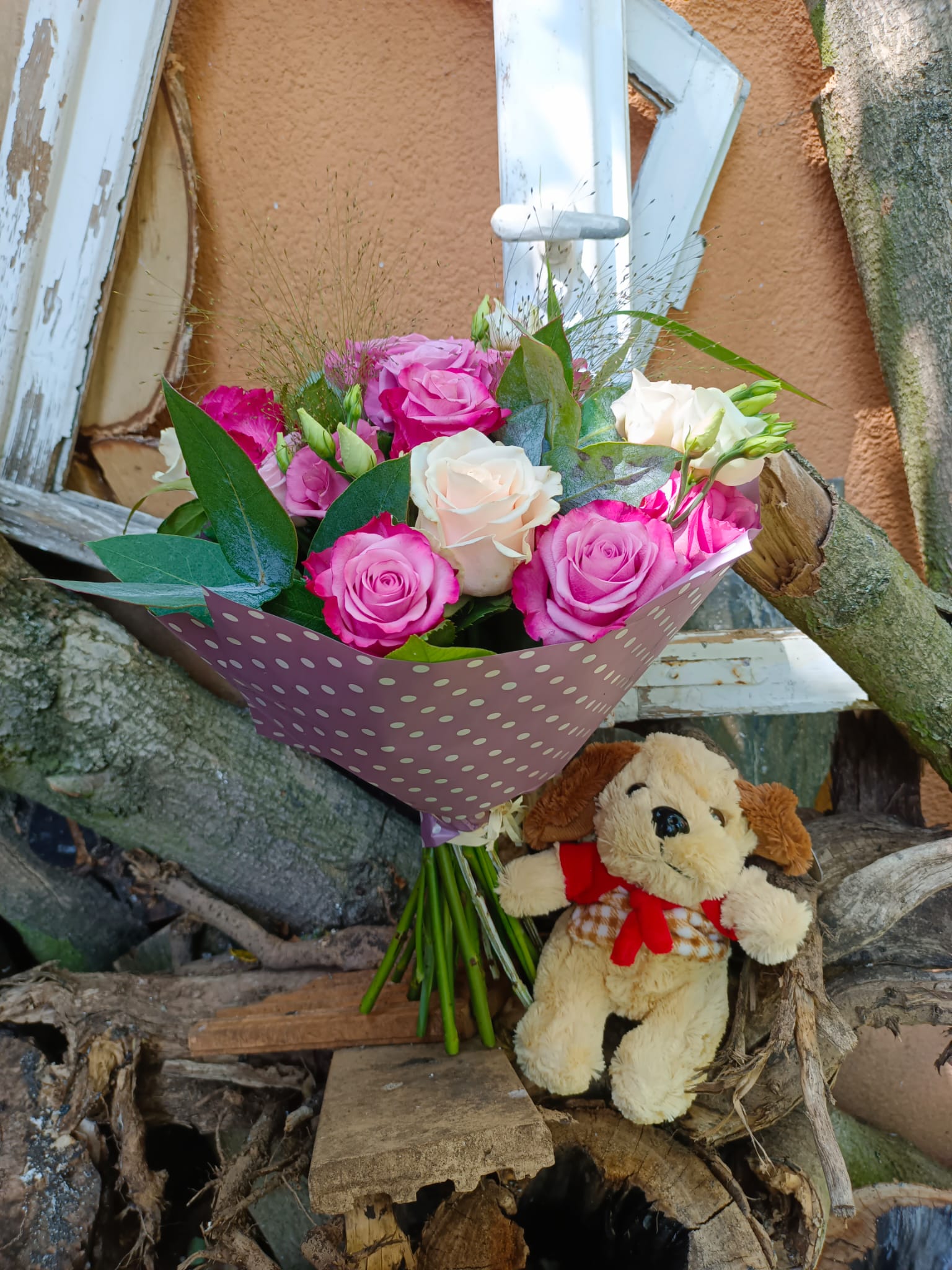 Piękny bukiet wiosenny, pełny wdzięczności i szczęścia. Kolorystyka różowo kremowa na pewno spodoba się nie jednej osobie. Bukiet z róż i innych dodatków.