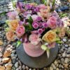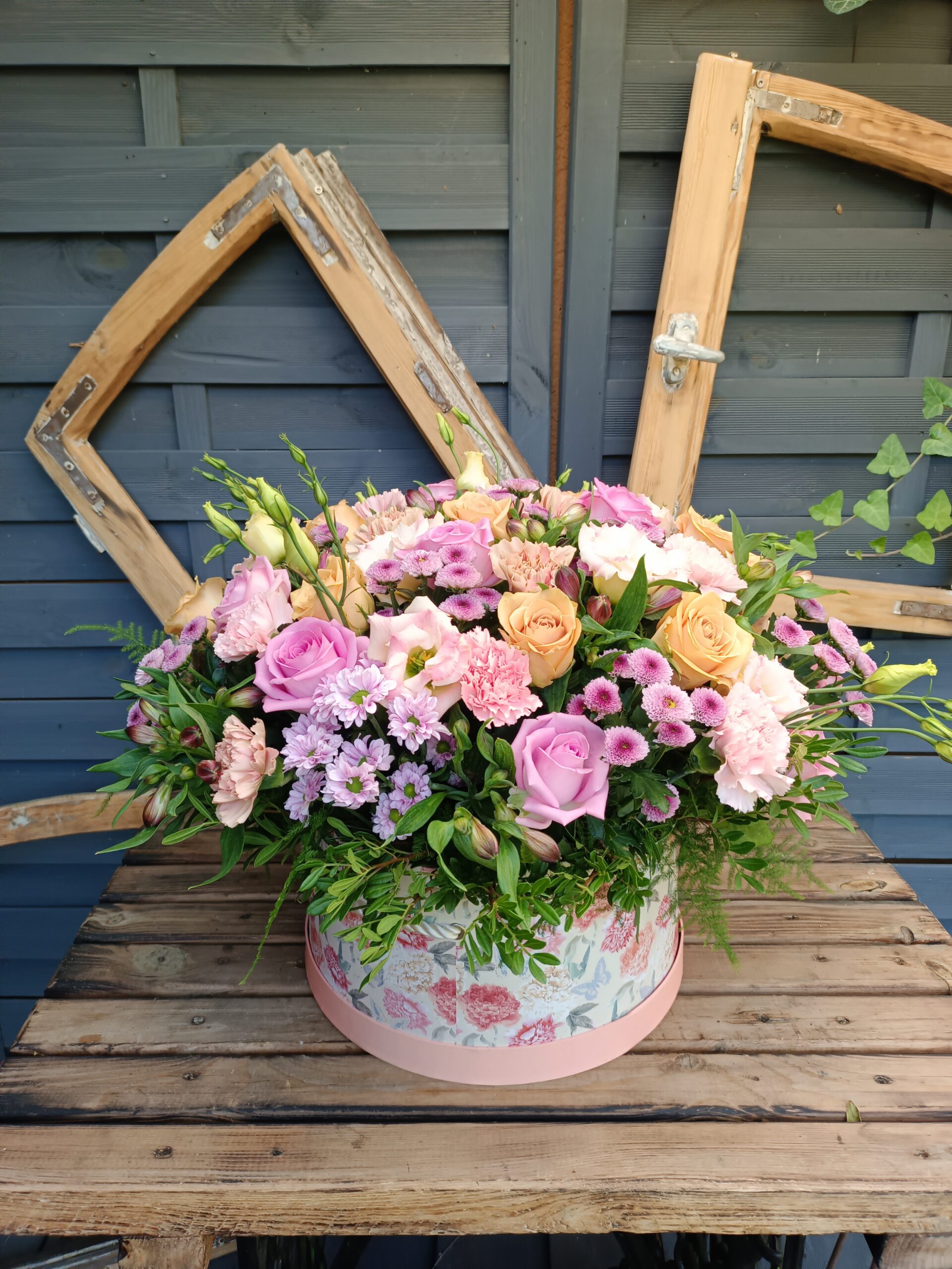 Skład Flower Boxa: róża, goździk, eustoma, santini, alstremeria, zieleń dekoracyjna