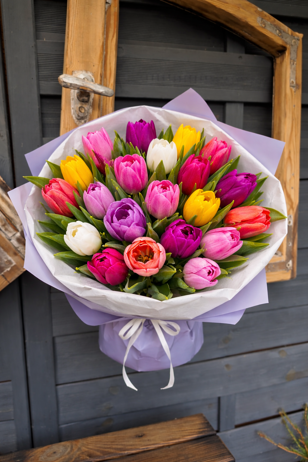 Kolorowe tulipany z zielonym przybraniem w bogatym papierze. Bukiet który onieśmiela i zachwyca. Tulipany o kwiaty wiosenne jednakże w naszej kwiaciarni zdobędziesz je również zimą.