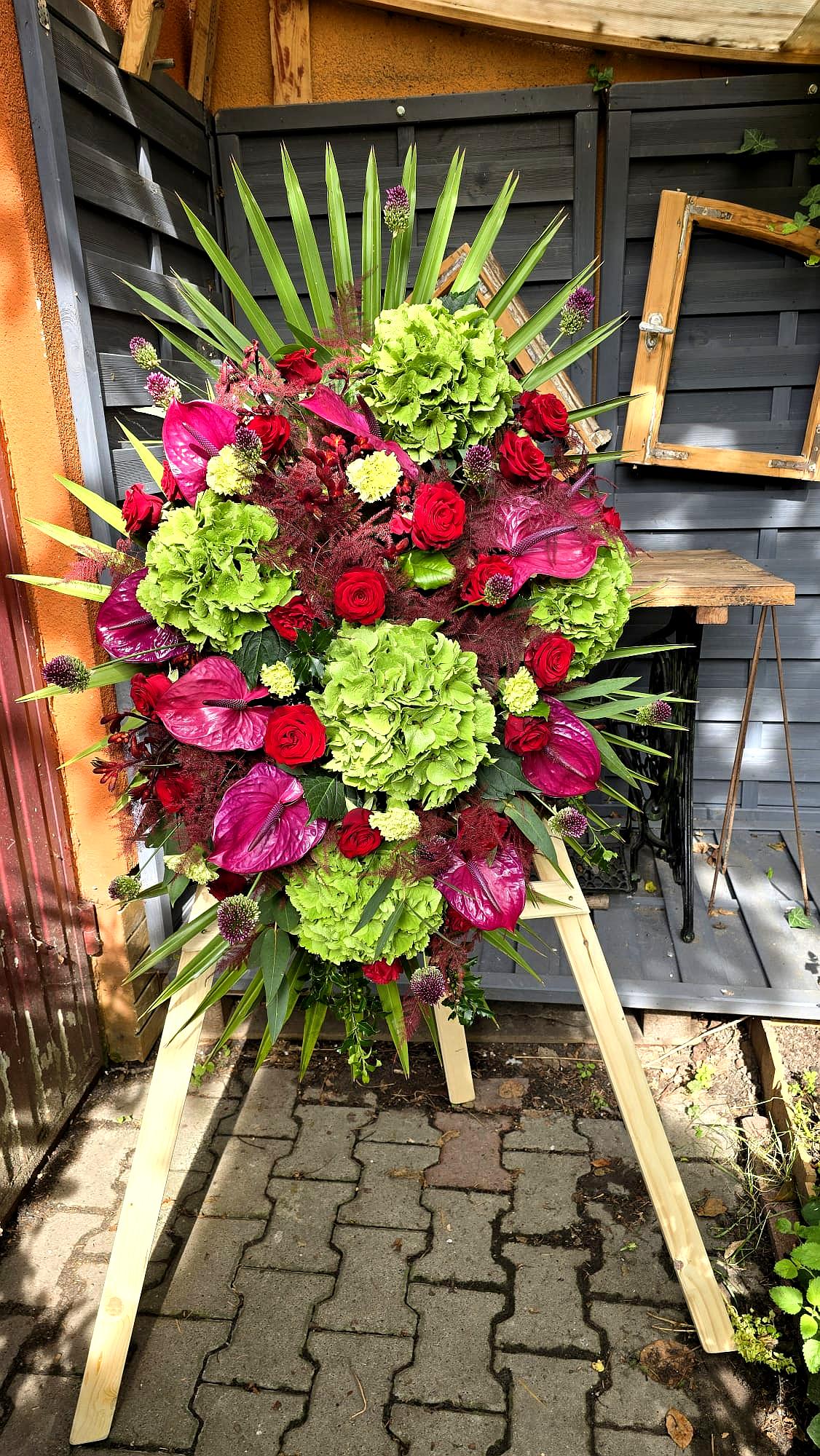 Wyjątkowy, wykonany z sercem wieniec pogrzebowy o imponującej formie i bogatej kompozycji kwiatowej. Zaprojektowany z myślą o godnym i eleganckim pożegnaniu bliskiej osoby.