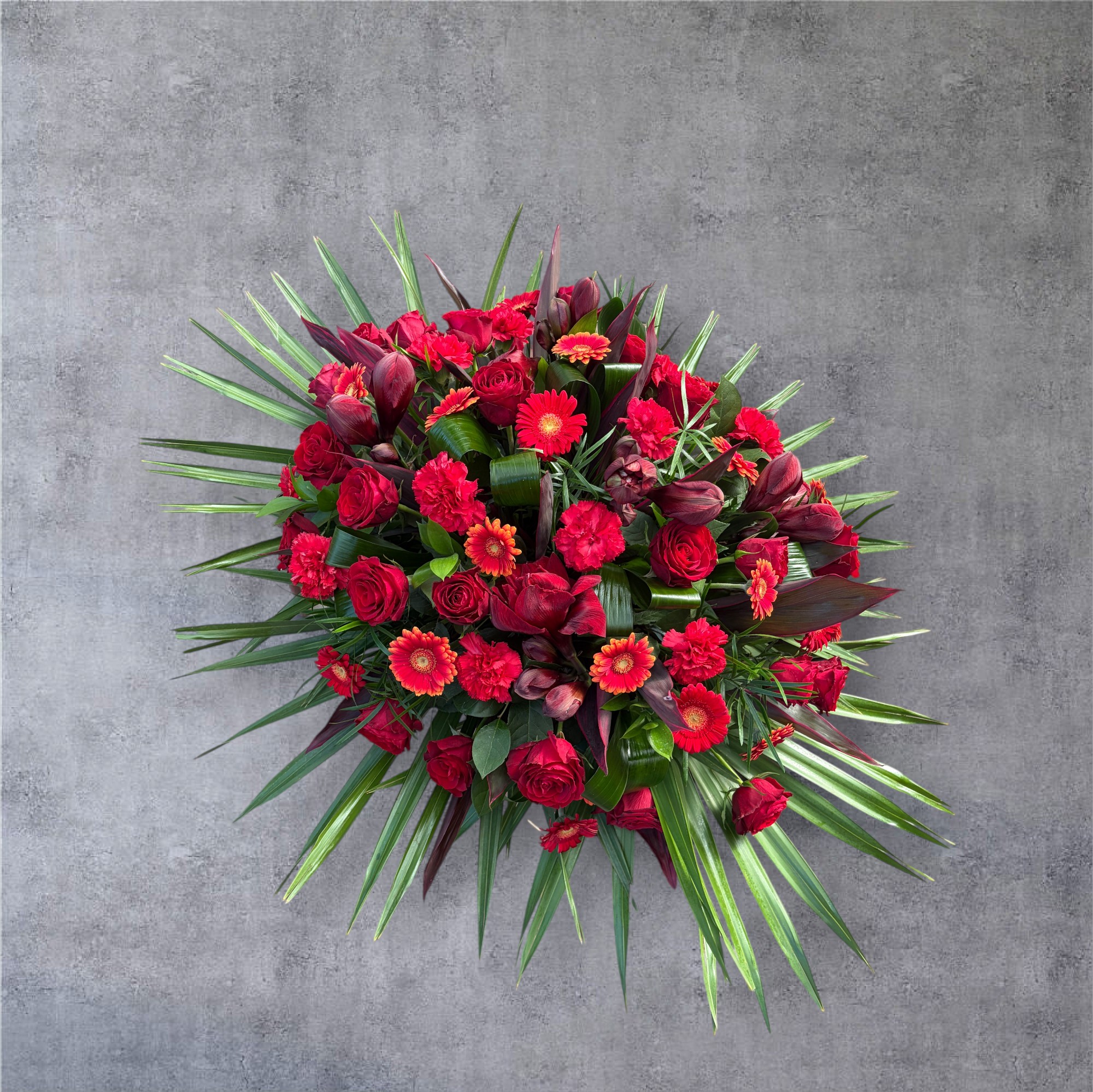 Wieniec skomponowany z czerwonych mieszanych kwiatów z przybraniem. Kompozycja pełna miłości i szacunku do zmarłej osoby.